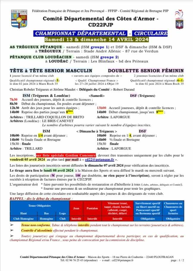 Départementaux Tête à Tête Senior Masculin - Doublettes Sénior Féminin à Trégueux