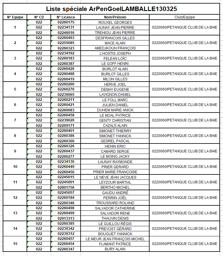 Liste des Equipes inscrites au Challenge Ar Pen Goël à Lamballe le Jeudi 13 Mars 2025